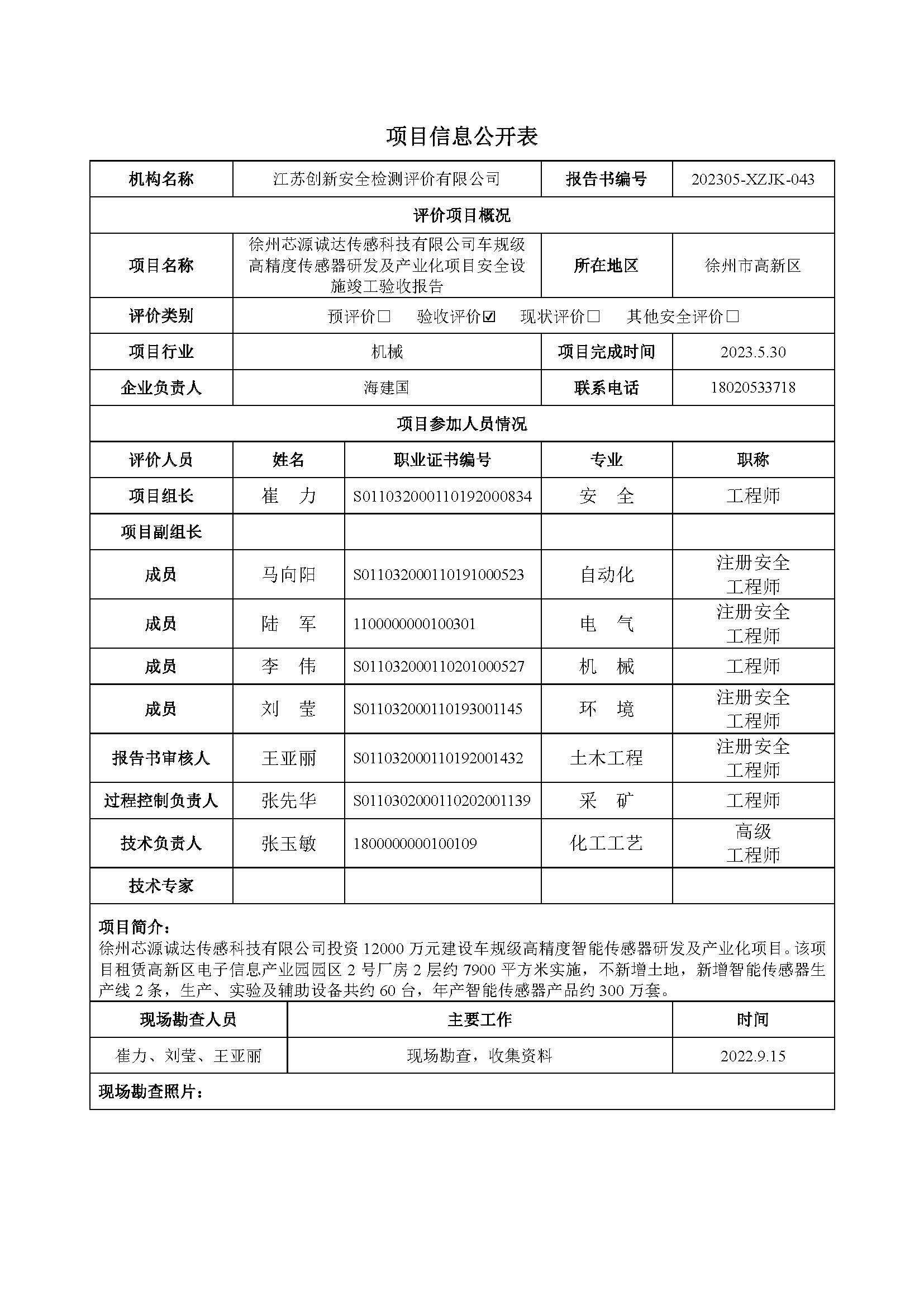 徐州芯源诚达传感科技有限公司车规级高精度传感器研发及产业化项目安全设施竣工验收报告