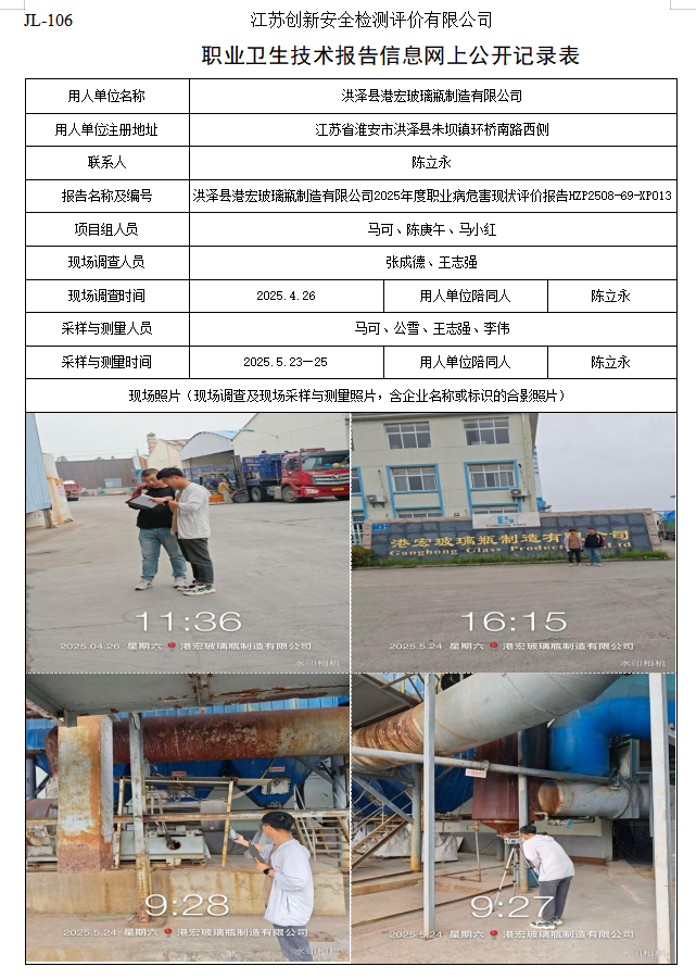 洪泽县港宏玻璃瓶制造有限公司2025年度职业病危害现状评价报告
