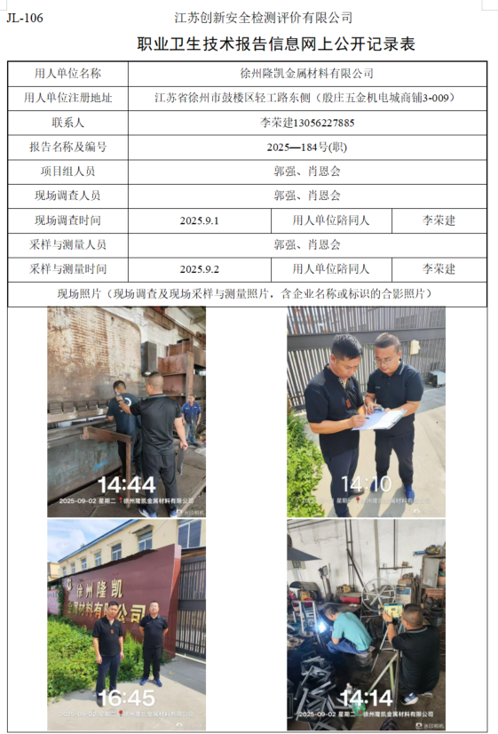 徐州隆凯金属材料有限公司职业卫生检测项目公示