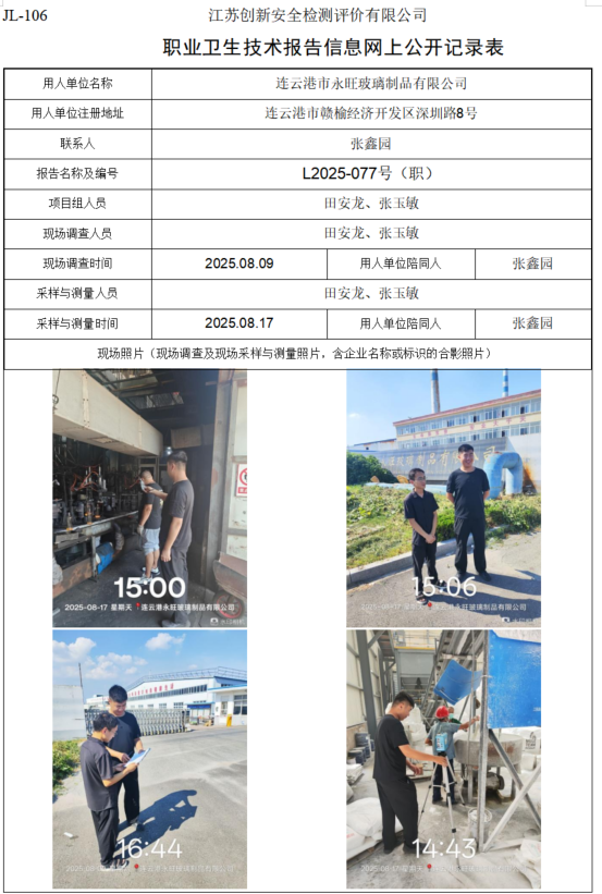 连云港市永旺玻璃制品有限公司职业卫生检测项目公示