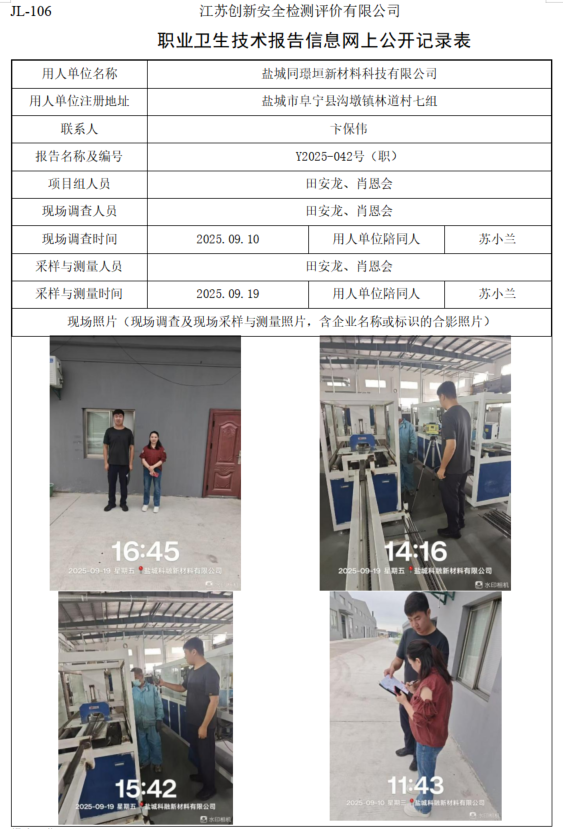 盐城同璟垣新材料科技有限公司职业卫生检测项目公示