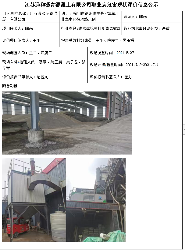 江苏通和沥青混凝土有限公司职业病危害现状评价信息公示