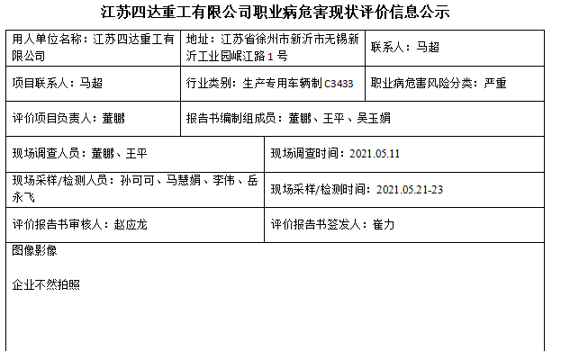 江苏四达重工有限公司职业病危害现状评价信息公示