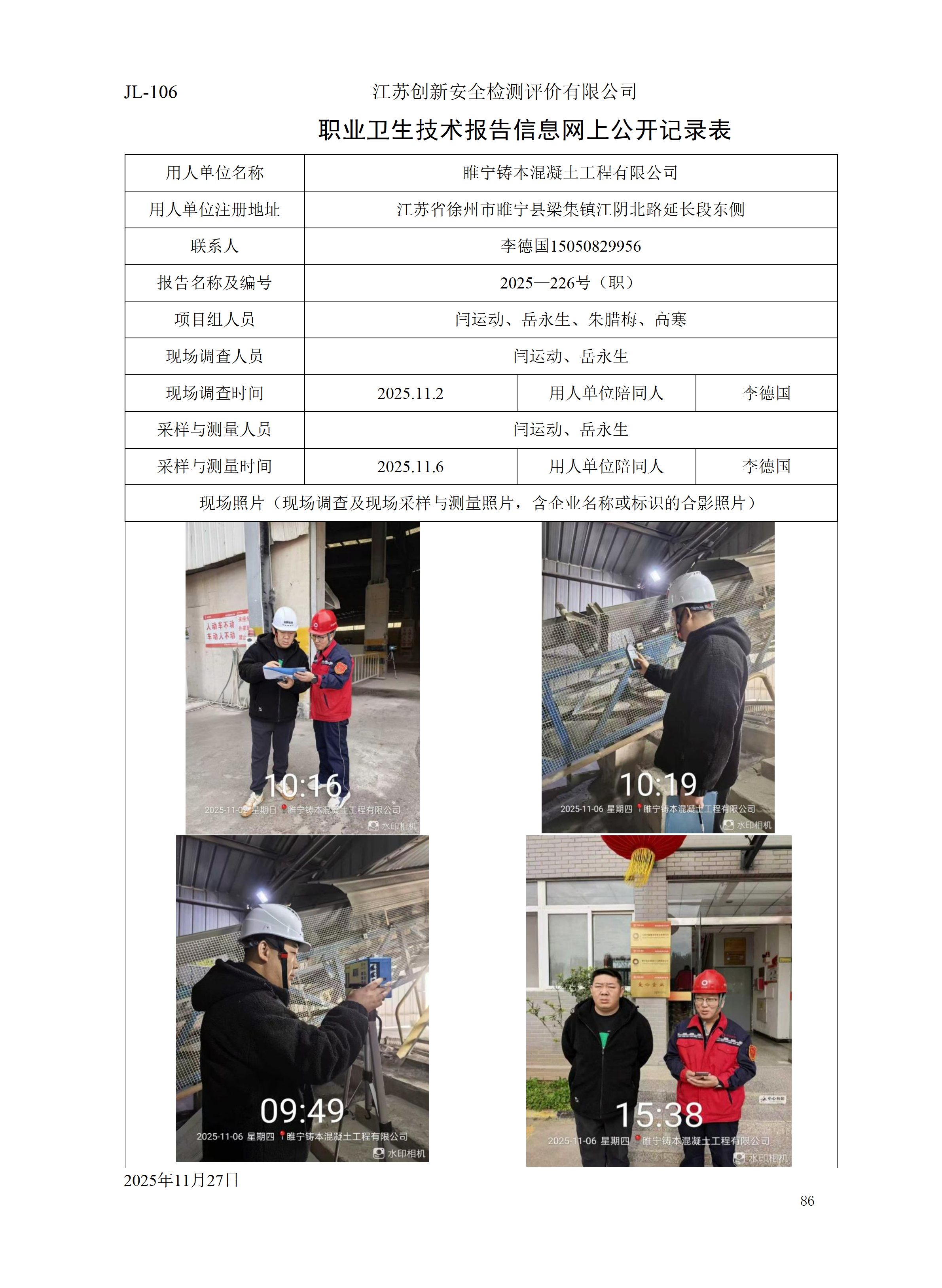 睢宁铸本混凝土工程有限公司职业卫生检测项目公示