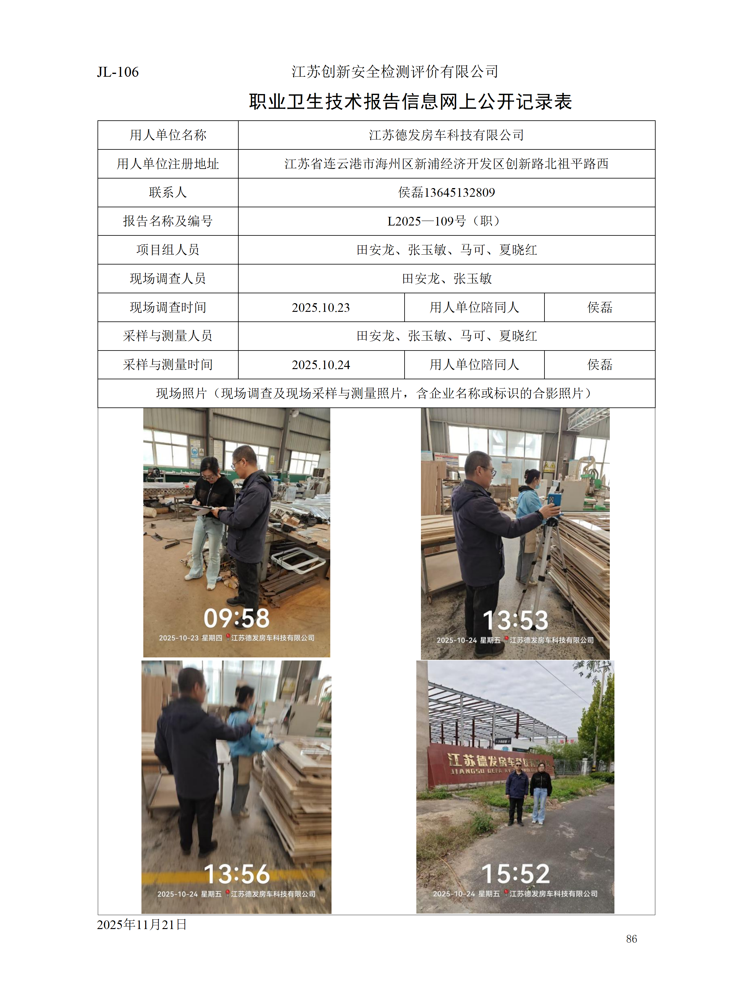 江苏德发房车科技有限公司职业卫生检测项目公示