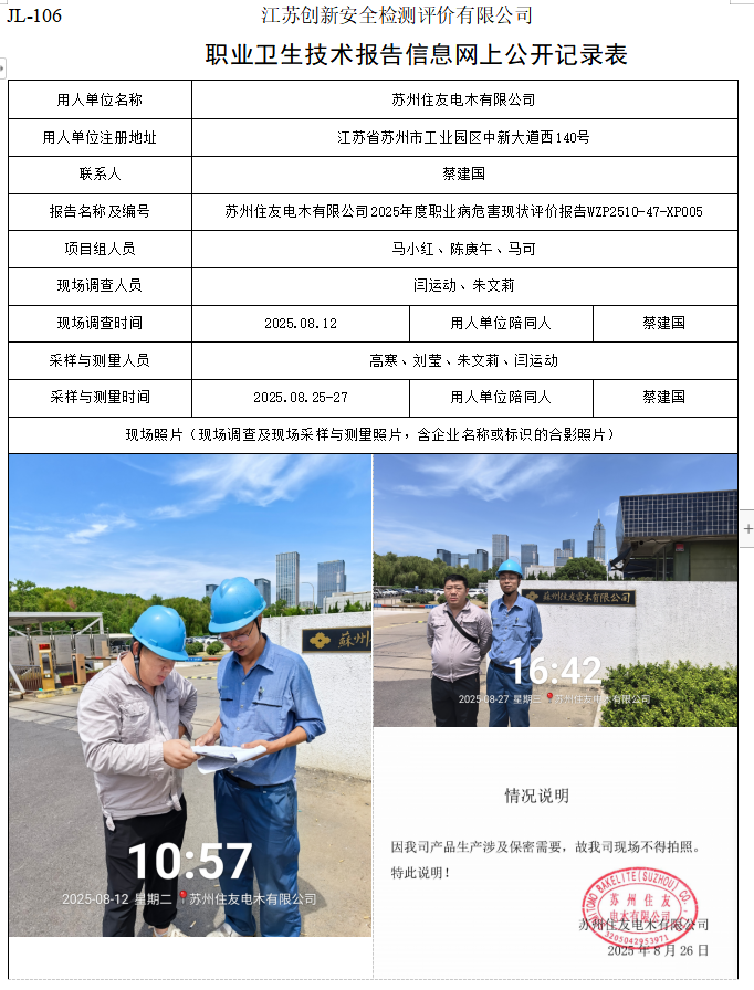 苏州住友电木有限公司2025年度职业病危害现状评价报告