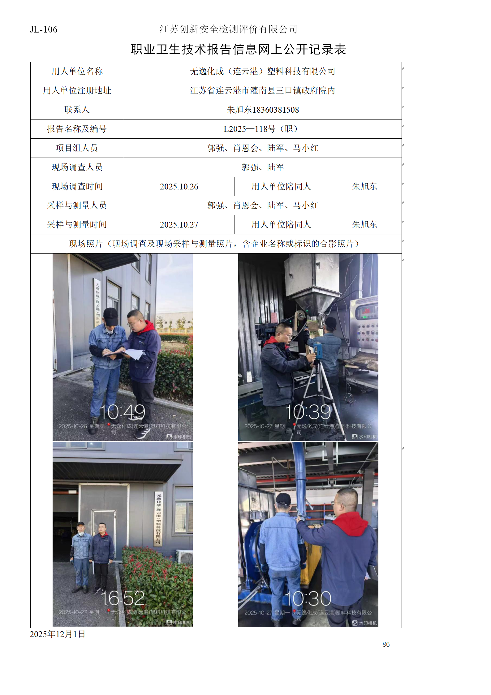 无逸化成(连云港)塑料科技有限公司职业卫生检测项目公示