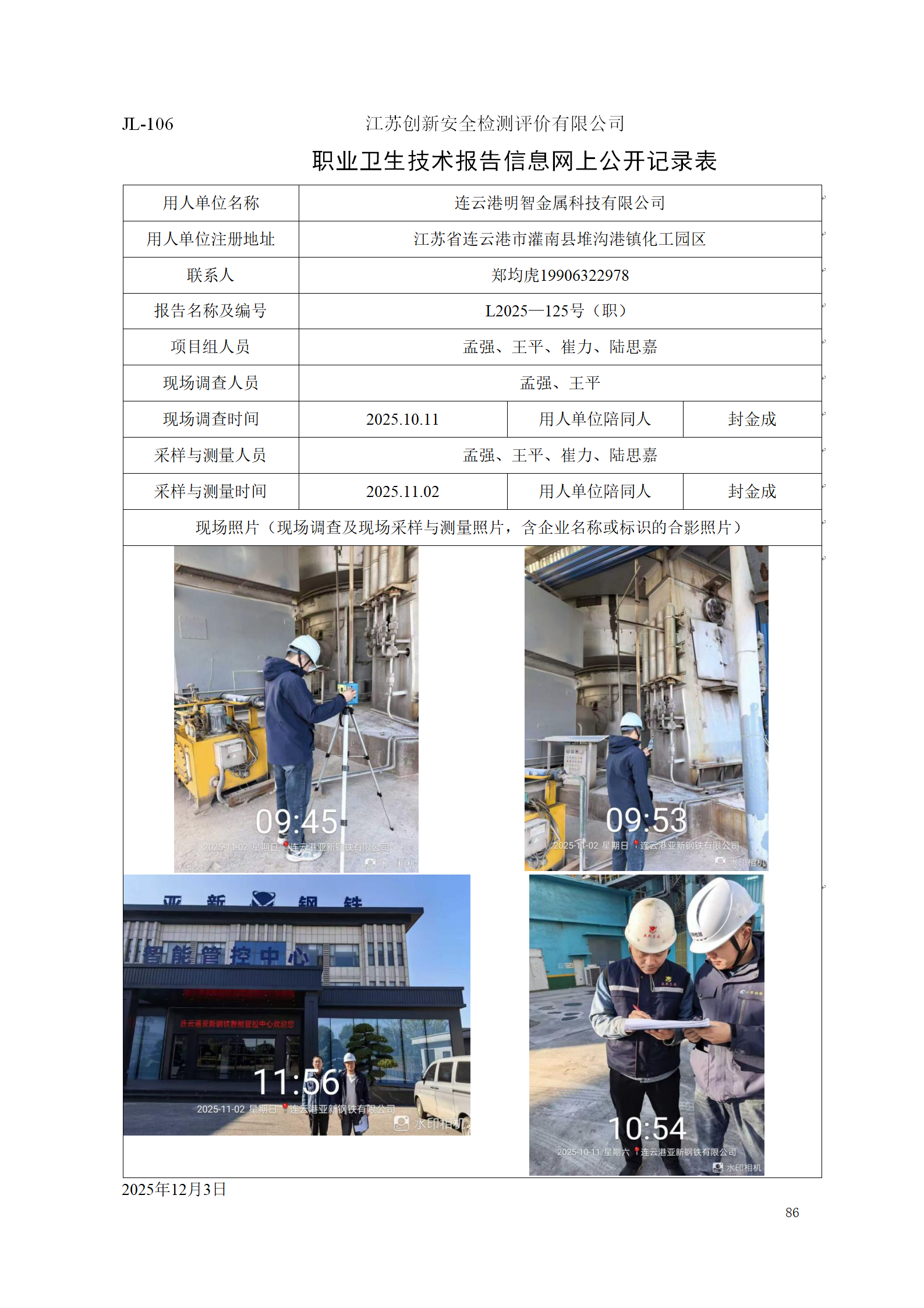 连云港亚新钢铁有限公司(炼铁厂高炉区域)职业卫生定期检测项目公示
