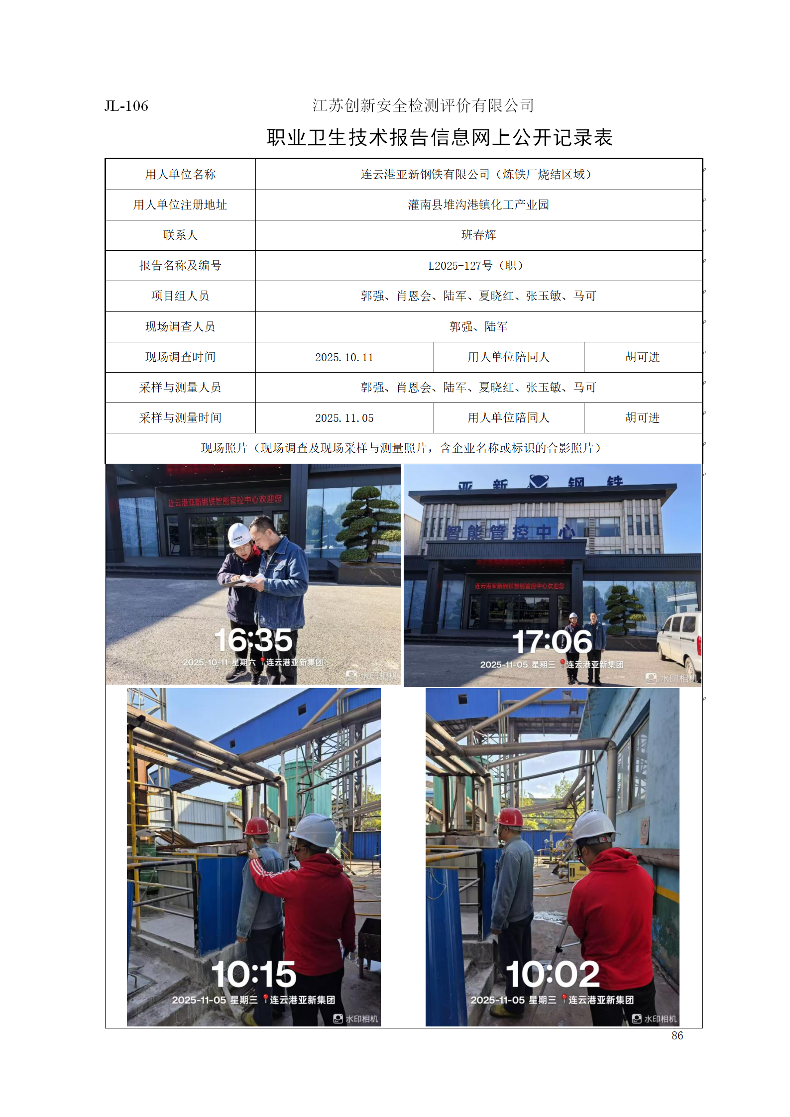 连云港亚新钢铁有限公司(炼铁厂烧结区域)职业卫生定期检测项目公示