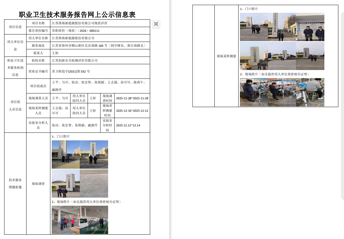 江苏淮海新能源股份有限公司2025年度职业病危害现状评价报告
