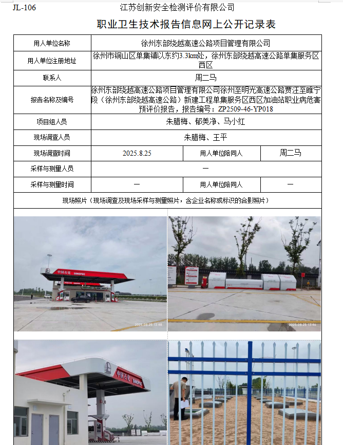 徐州东部绕越高速公路项目管理有限公司徐州至明光高速公路贾汪至睢宁段(徐州东部绕越高速公路)新建工程单集服务区东区加油站职业病危害预评价报告