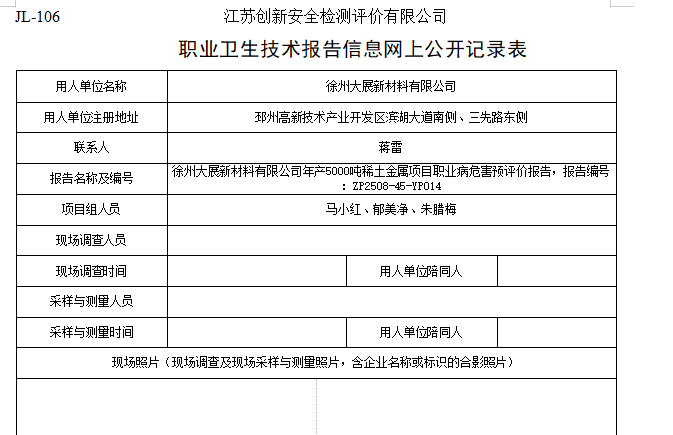 徐州大展新材料有限公司年产5000吨稀土金属项目职业病危害预评价报告