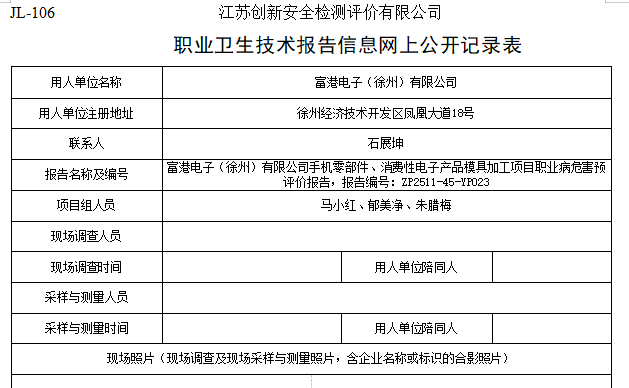 富港电子(徐州)有限公司手机零部件、消费性电子产品模具加工项目职业病危害预评价报告