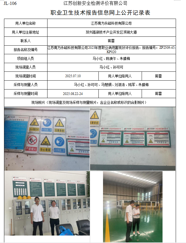 江苏南方永磁科技有限公司2025年度职业病危害现状评价报告