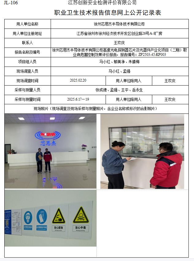 徐州芯思杰半导体技术有限公司高速光电探测器芯片及光器件产业化项目(二期)职业病危害控制效果评价报告