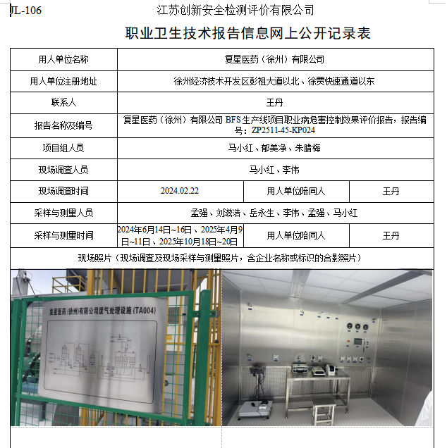 复星医药(徐州)有限公司BFS生产线项目职业病危害控制效果评价报告
