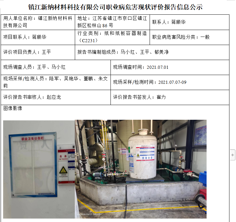 镇江新纳材料科技有限公司职业病危害现状评价报告信息公示