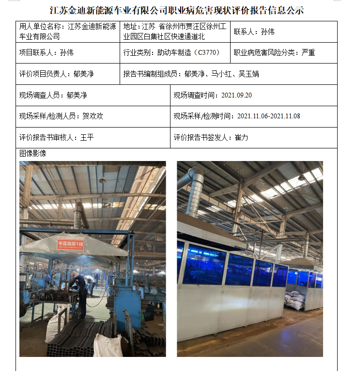 江苏金迪新能源车业有限公司职业病危害现状评价报告信息公示