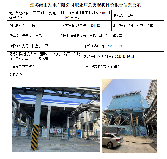 江苏阚山发电有限公司职业病危害现状评价报告信息公示