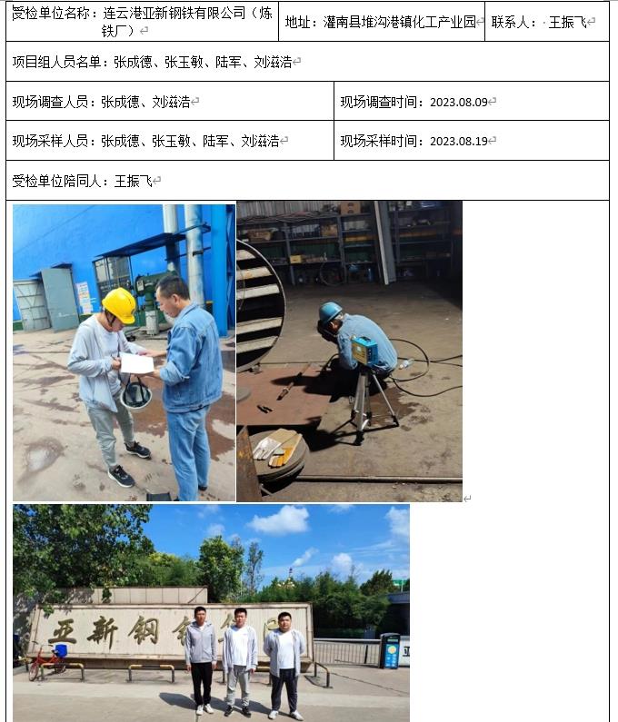 连云港亚新钢铁有限公司(炼铁厂) 职业卫生检测项目公示