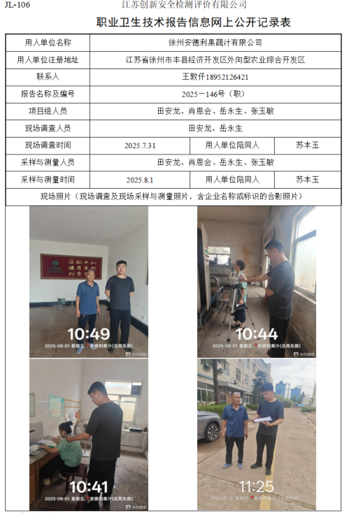 徐州安德利果蔬汁有限公司职业卫生检测项目公示