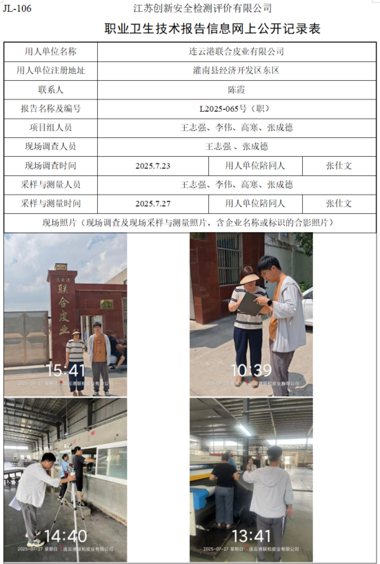 连云港联合皮业有限公司职业卫生检测项目公示