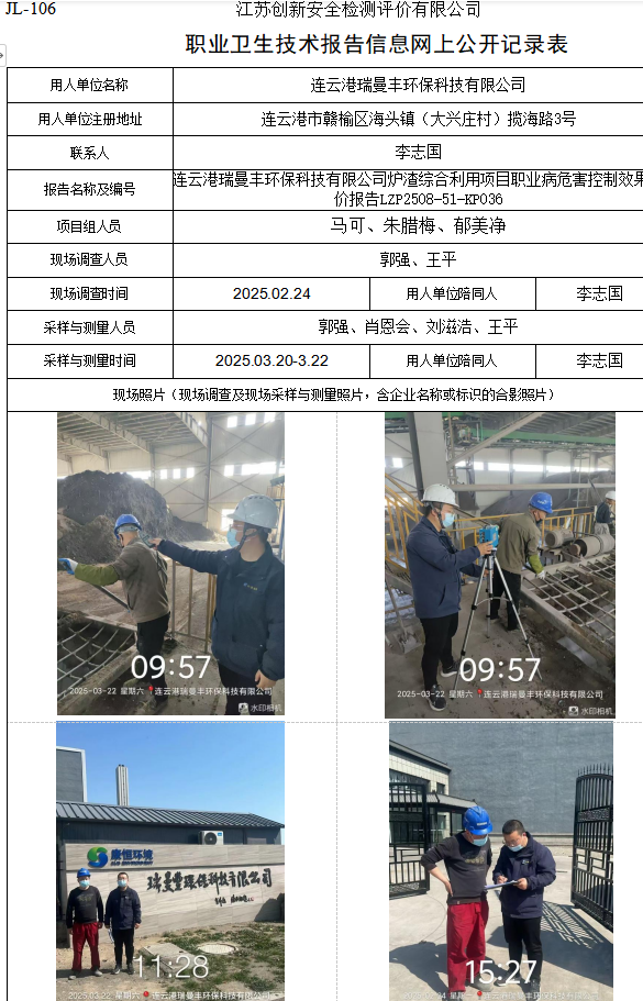 连云港瑞曼丰环保科技有限公司炉渣综合利用项目职业病危害控制效果评价报告