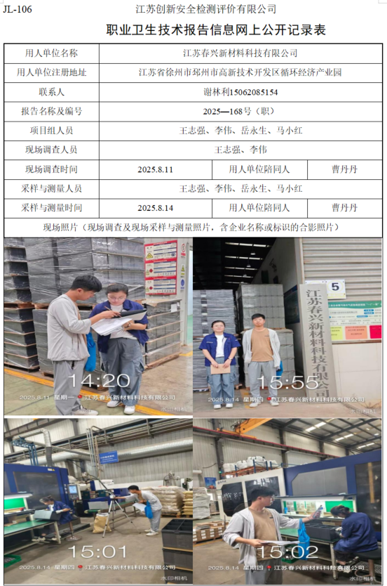 江苏春兴新材料科技有限公司职业卫生检测项目公示