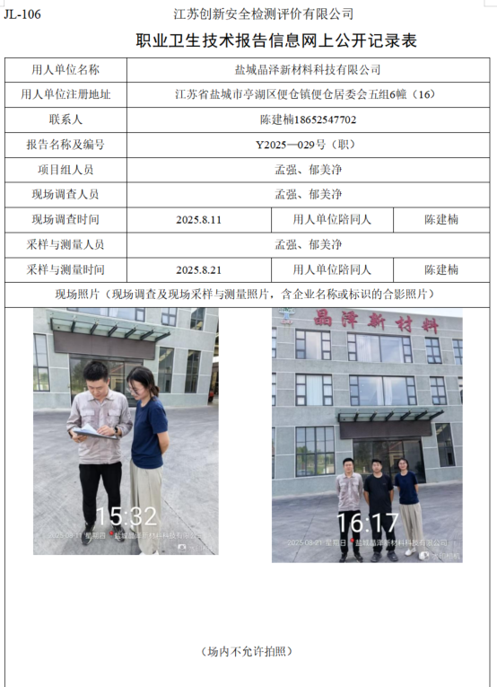 盐城晶泽新材料科技有限公司职业卫生检测项目公示