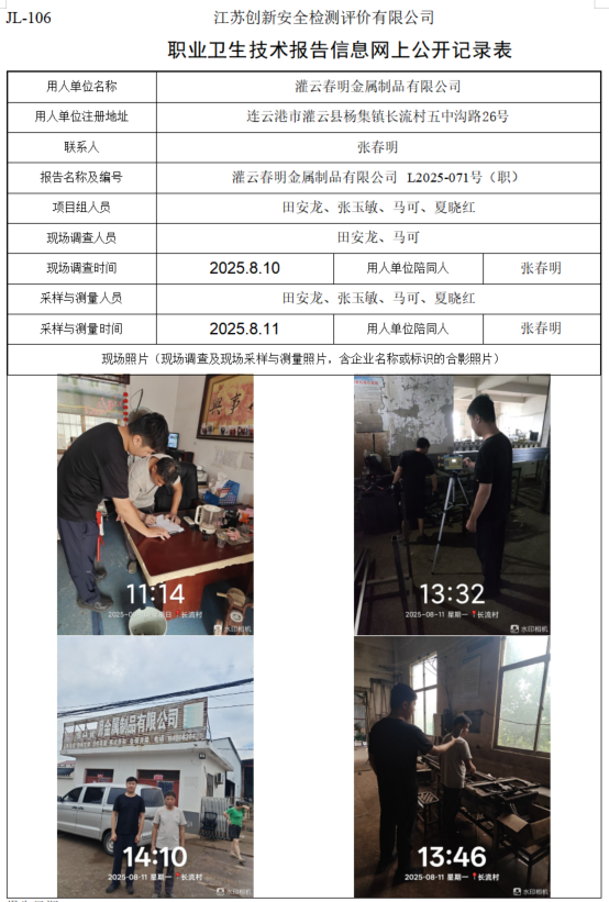 灌云春明金属制品有限公司职业卫生检测项目公示