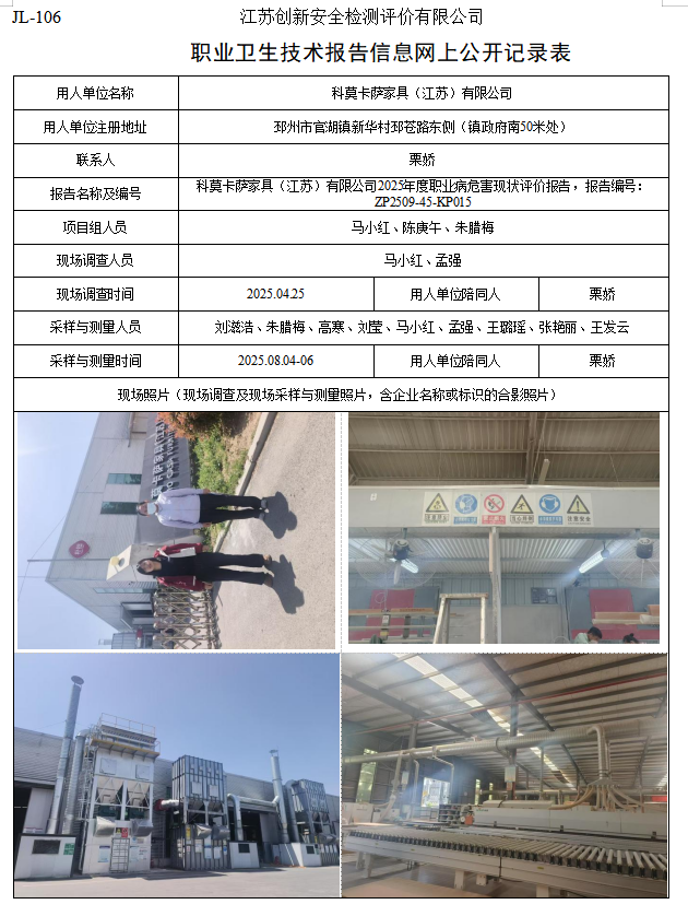 科莫卡萨家具(江苏)有限公司2025年度职业病危害现状评价报告