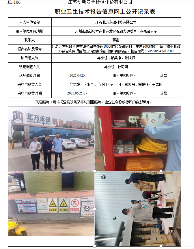 江苏北方永磁科技有限公司年处理10000吨钕铁硼废料、年产3000吨稀土氧化物资源循环综合利用项目职业病危害控制效果评价报告