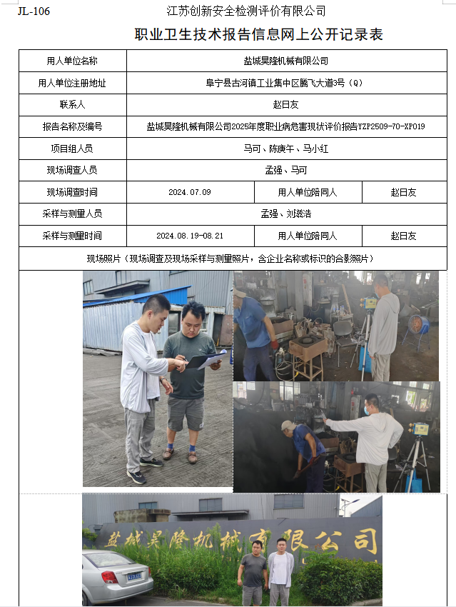 盐城昊隆机械有限公司2025年度职业病危害现状评价报告