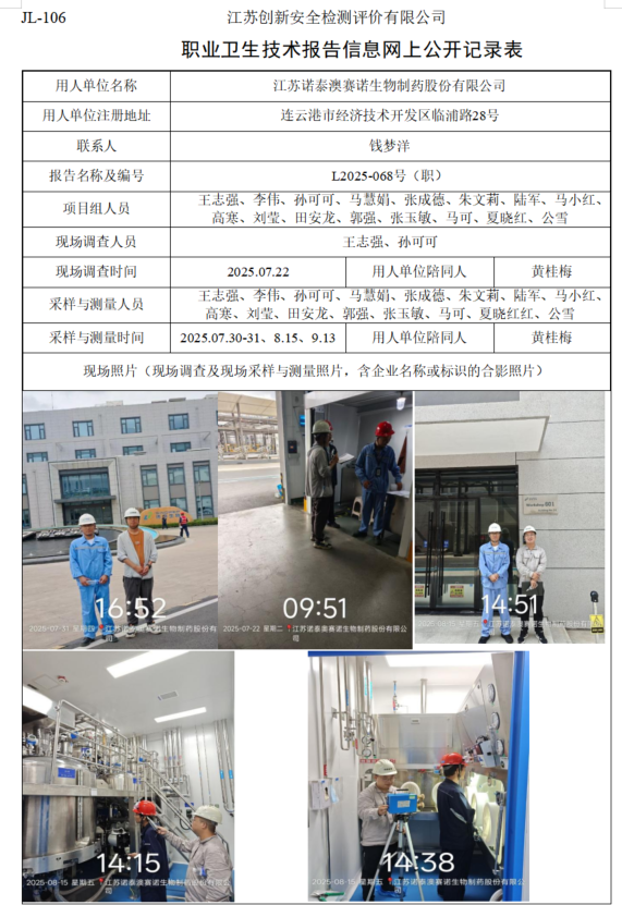 江苏诺泰澳赛诺生物制药股份有限公司职业卫生检测项目信息公开
