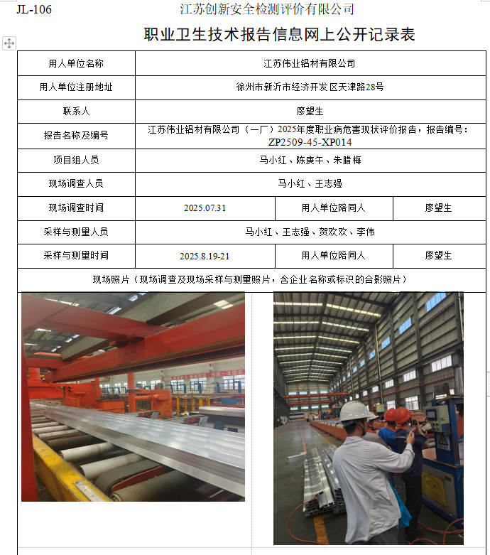 江苏伟业铝材有限公司(一厂)2025年度职业病危害现状评价报告