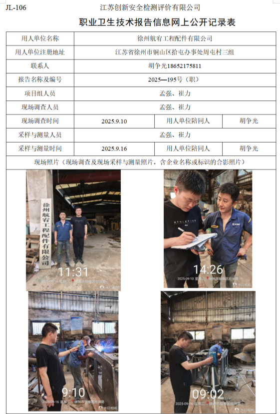 徐州航宥工程配件有限公司职业卫生定期检测项目公示