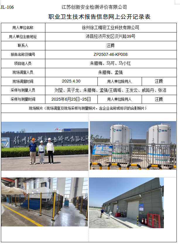 徐州徐工精密工业科技有限公司徐工高端零部件智能化制造项目(一期工程)职业病危害控制效果评价报告