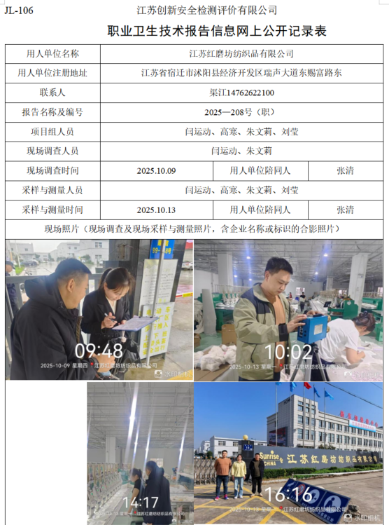 江苏红磨坊纺织品有限公司职业卫生检测项目公示