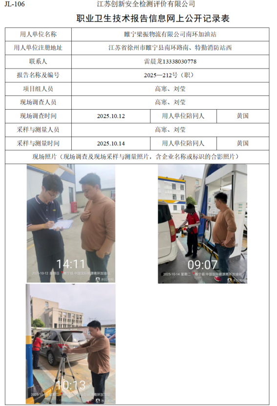 睢宁梁振物流有限公司南环加油站职业卫生检测项目公示