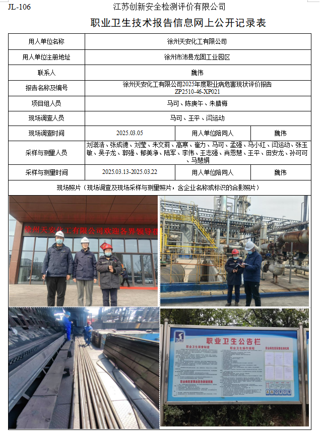 徐州天安化工有限公司2025年度职业病危害现状评价报告