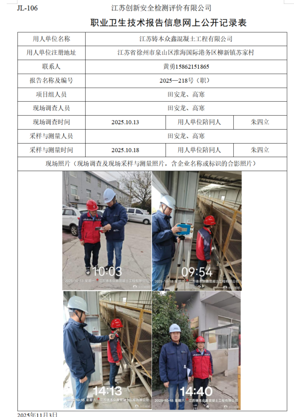 江苏铸本众鑫混凝土工程有限公司职业卫生定期检测项目公示