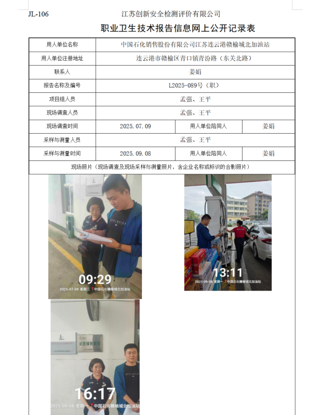 中国石化销售股份有限公司江苏连云港赣榆城北加油站职业卫生检测项目公示