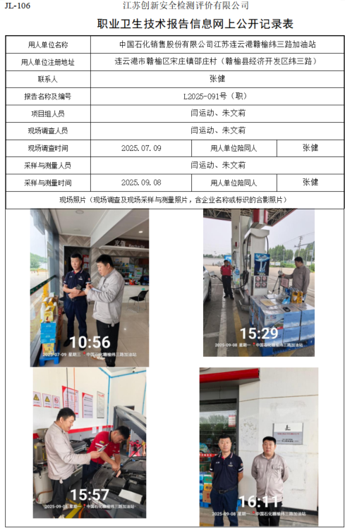 中国石化销售股份有限公司江苏连云港赣榆纬三路加油站职业卫生检测项目公示