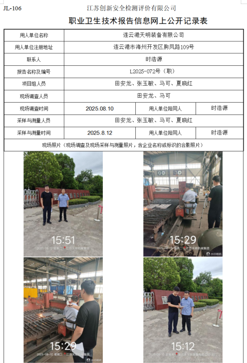 连云港天明装备有限公司职业卫生检测项目公示