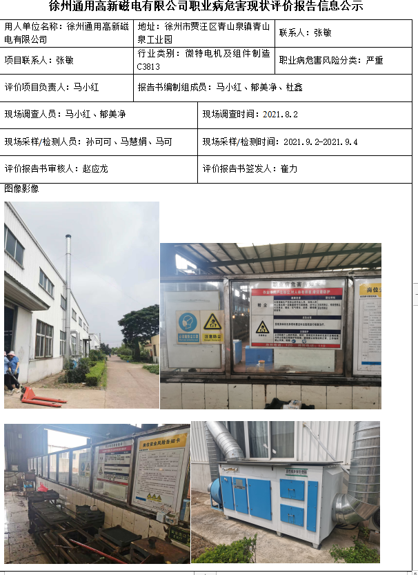 徐州通用高新磁电有限公司职业病危害现状评价报告信息公示