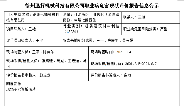 徐州迅辉机械科技有限公司职业病危害现状评价报告信息公示