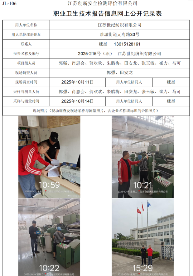 江苏世纪纺织有限公司职业卫生检测项目公示