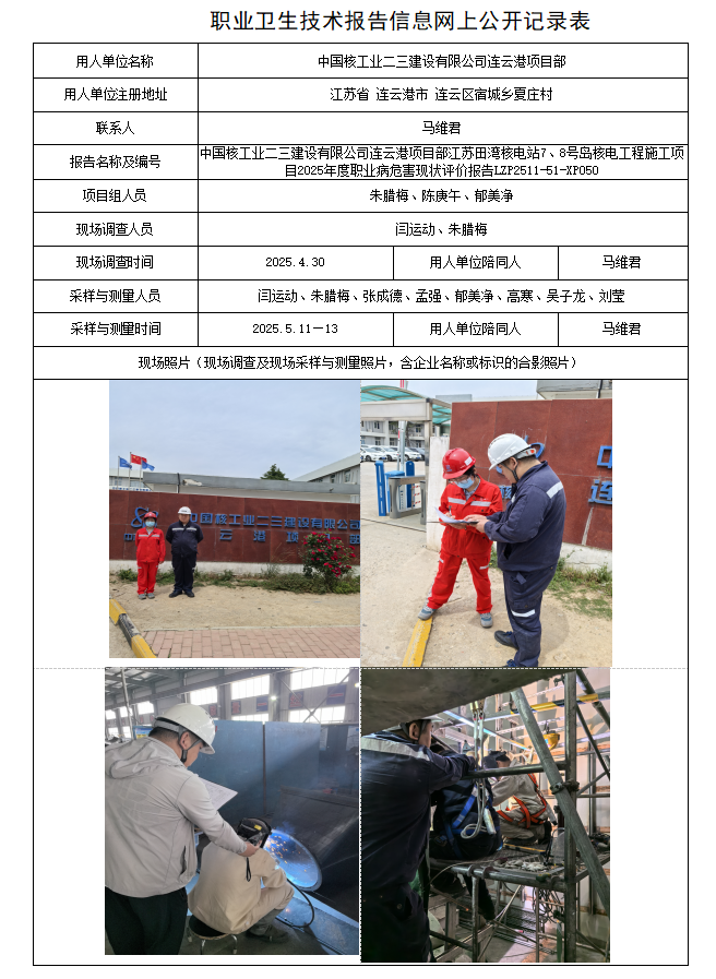 中国核工业二三建设有限公司连云港项目部江苏田湾核电站7、8号岛核电工程施工项目2025年度职业病危害现状评价报告
