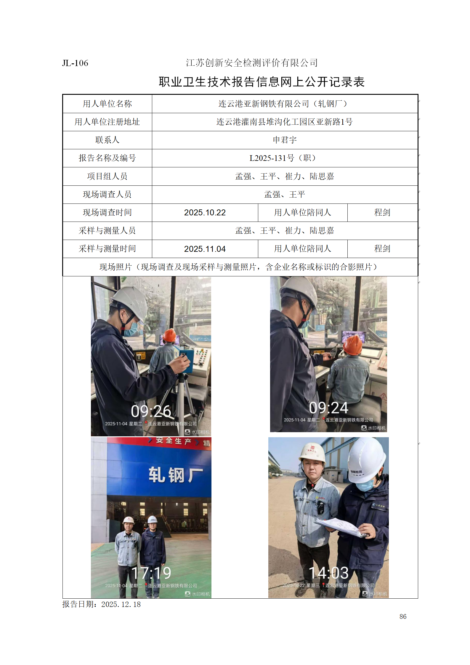 连云港亚新钢铁有限公司(轧钢厂)定期检测项目公示