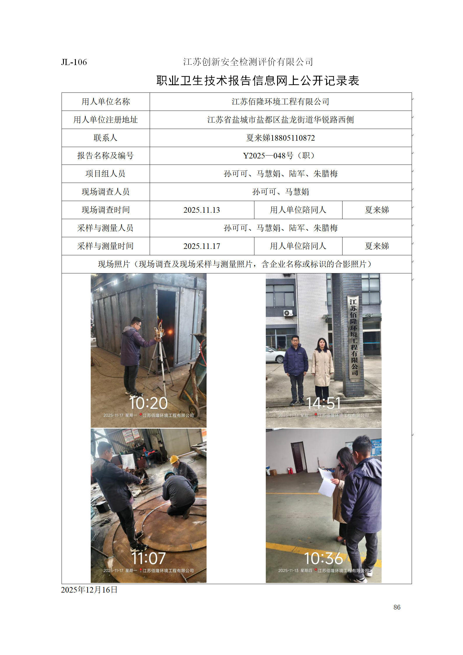 江苏佰隆环境工程有限公司检测项目公示